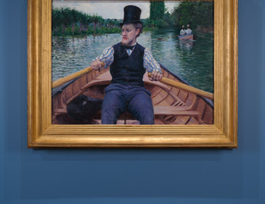 Gustave Caillebotte, Boating Party, circa 1877–1878, in situ, Espace Louis Vuitton New York; Courtesy of Louis Vuitton Im Espace Louis Vuitton in New York treffen derzeit zwei zentrale Werke Gustave Caillebottes aufeinander wie alte Freunde: Jeune homme à sa…